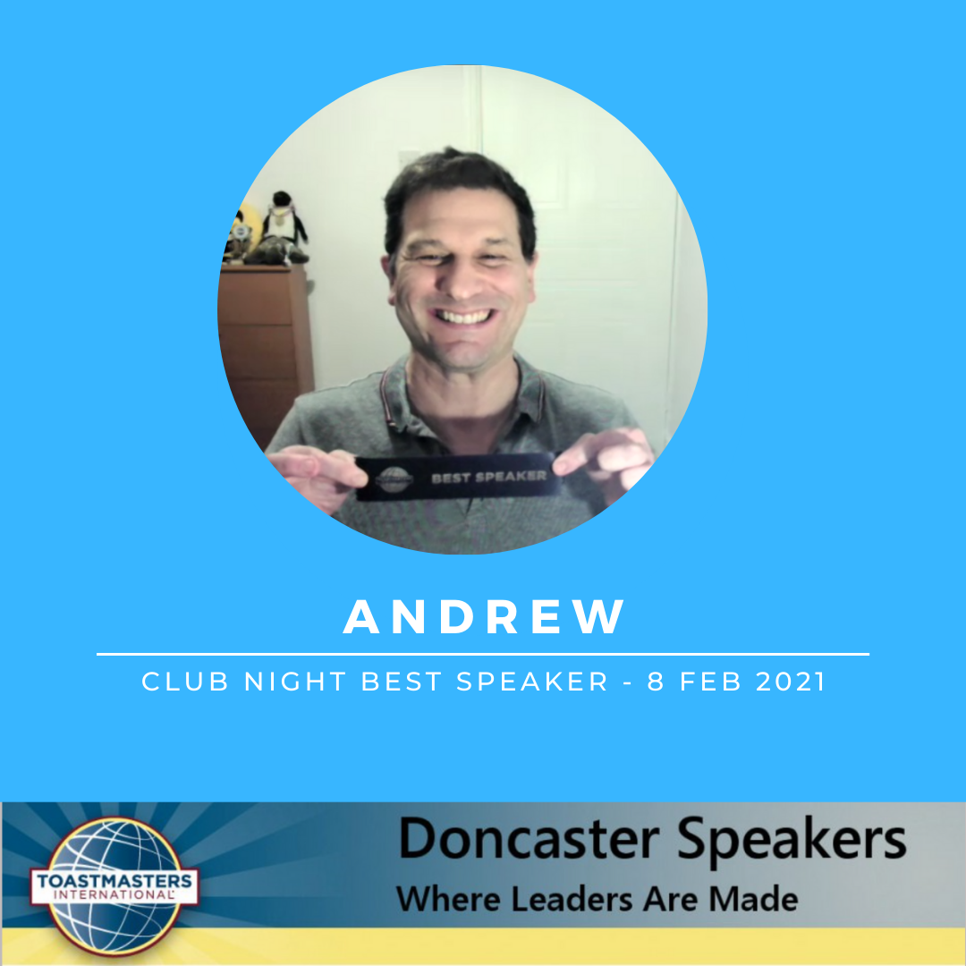 Andrew gave a speech in the eucation slot about his personal journey entering the Toastmasters International competion and give some tips for those looking to enter this years competition.