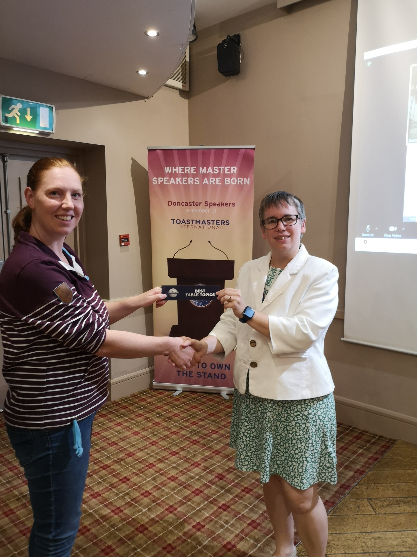 Best evaluator was a tie between Steven Bisby for his whistlestop tour of all 8 table topics, providing each speaker with both commendations and recommendations, and Stephanie Bisby’s overall report on the evening as General Evaluator.