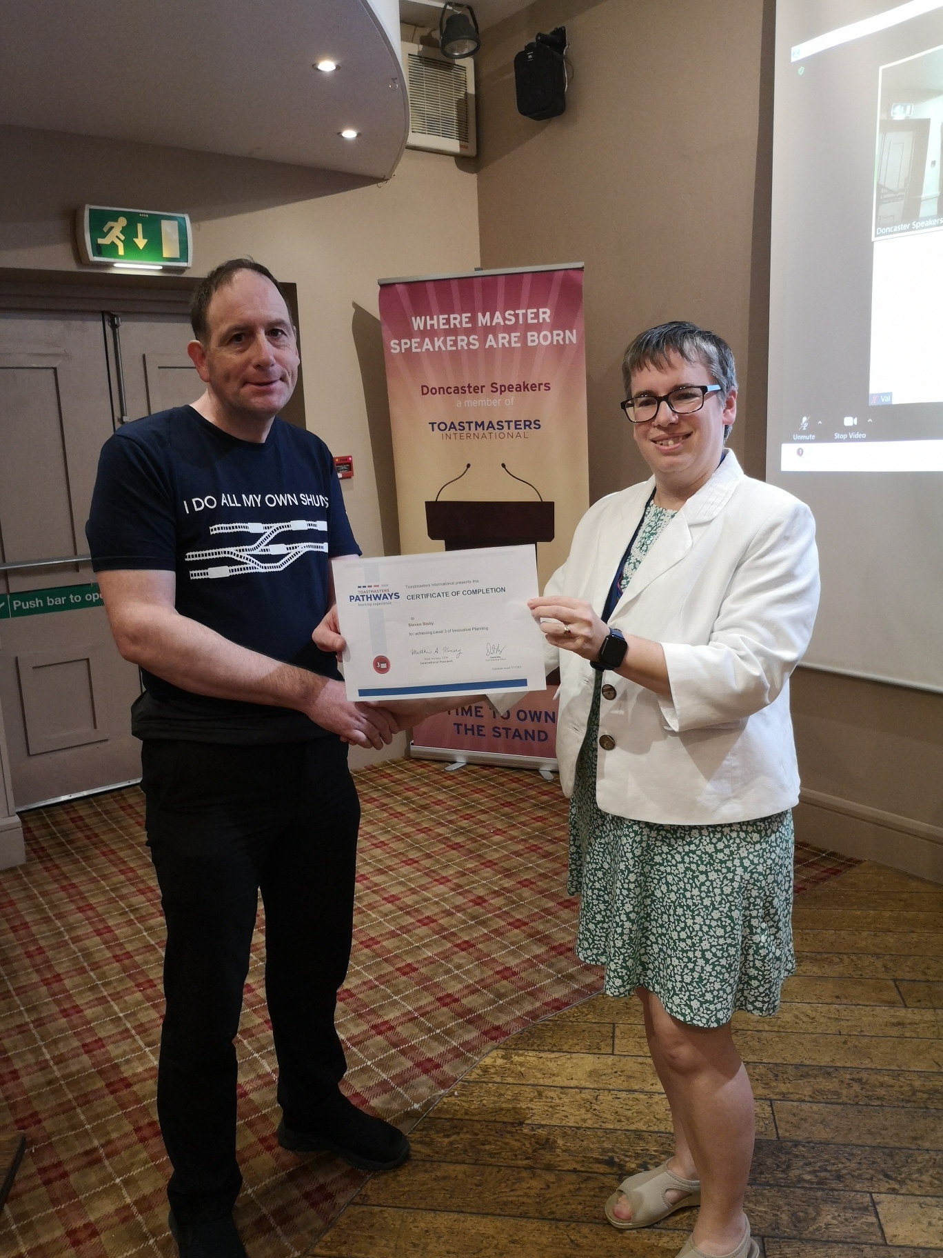 We also had two guests present, and the pleasure of presenting one of them with a First Timer award for taking on the challenge of deciding how to use the superpower of speed reading. Three members were also presented with certificates for completing levels of the Pathways educational programme, which is available to all Toastmasters members to help them improve their speaking skills.